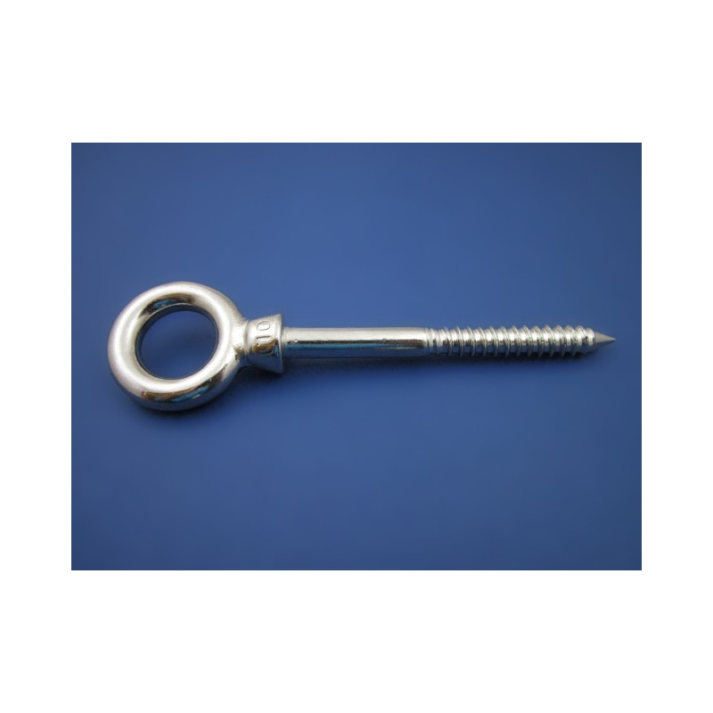 10x100 wkręt do drewna z uchem / wkręt oczkowy ze stali kwasoodpornej A4 Średnica wewnętrzna ucha: 22 Średnica gwintu: 10 Długość trzpienia: 100 Długość gwintu: 60
